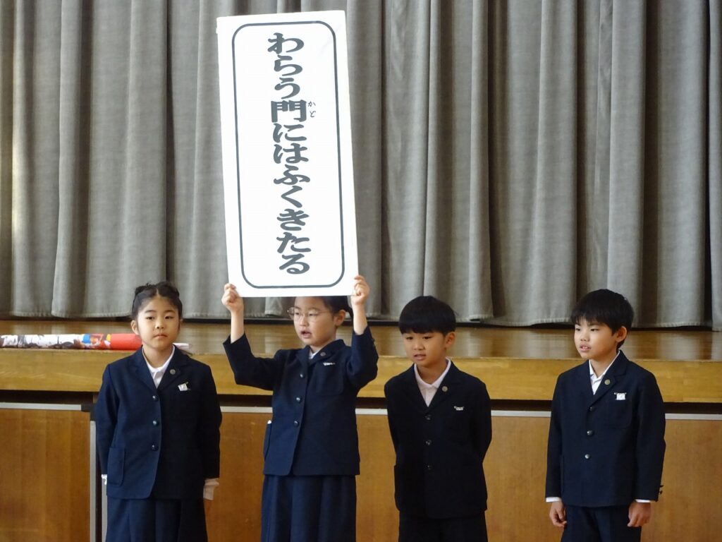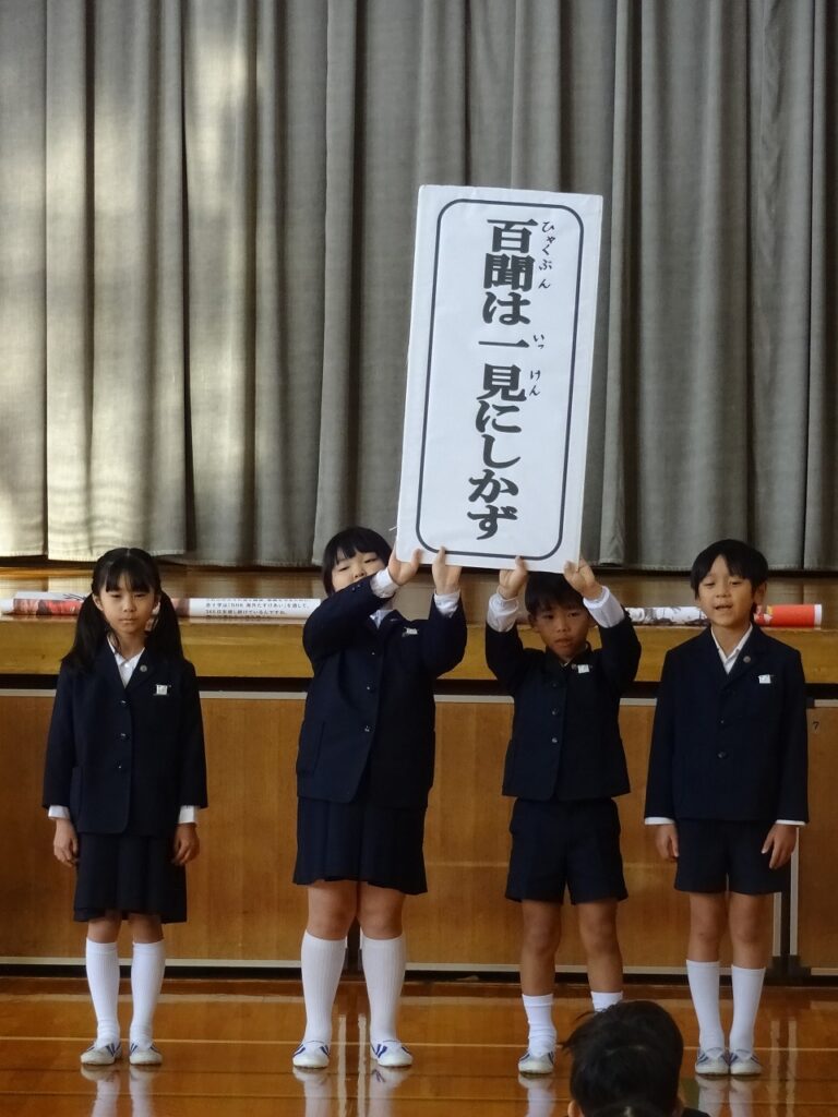 本日の児童朝会では、2年2組の子どもたちが1組に引き続き「ことわざ」の発表をしました。今まで学習してきた中から、今の生活で大切にしたい格言を6つ選んで、グループに分かれて発表をしました。「ことわざ」の意味と、自分たちの生活にいかしたいことを説明していました。