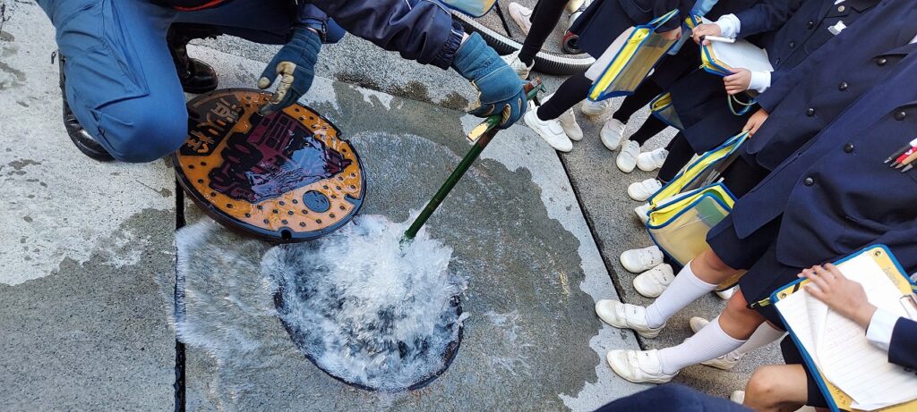 また、たくさんの種類の消防車や救急車、その他施設を見せていただきました。さらに、放水体験もさせていただきました。