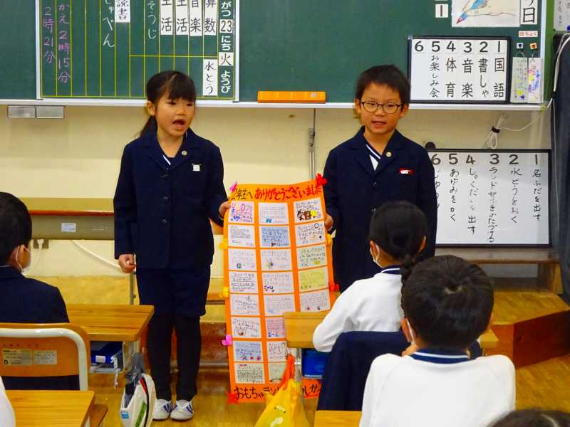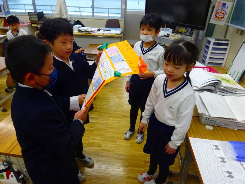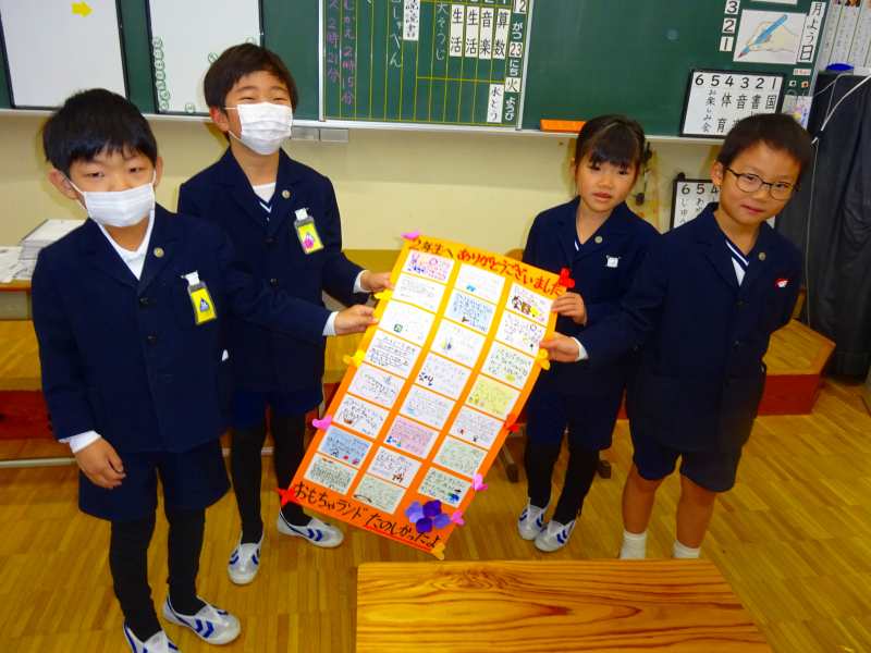 先日、2年生のおもちゃランドに招待してもらいました。工夫されたおもちゃがたくさんあって、楽しい時間を過ごすことができました。「おもしろいおもちゃが手作りできるなんて、すごい!」と、2年生の素晴らしさを実感した1年生でした。「楽しいおもちゃばかりだった。」「もっと遊びたかったな。」「わたしが2年生になったら、今の2年生みたいに作ってみたい!」と、教室に戻ってきても興奮が冷めない様子でした。そこで、1年生は、楽しかったことやそれぞれの思いをメッセージに書き、お礼に行きました。