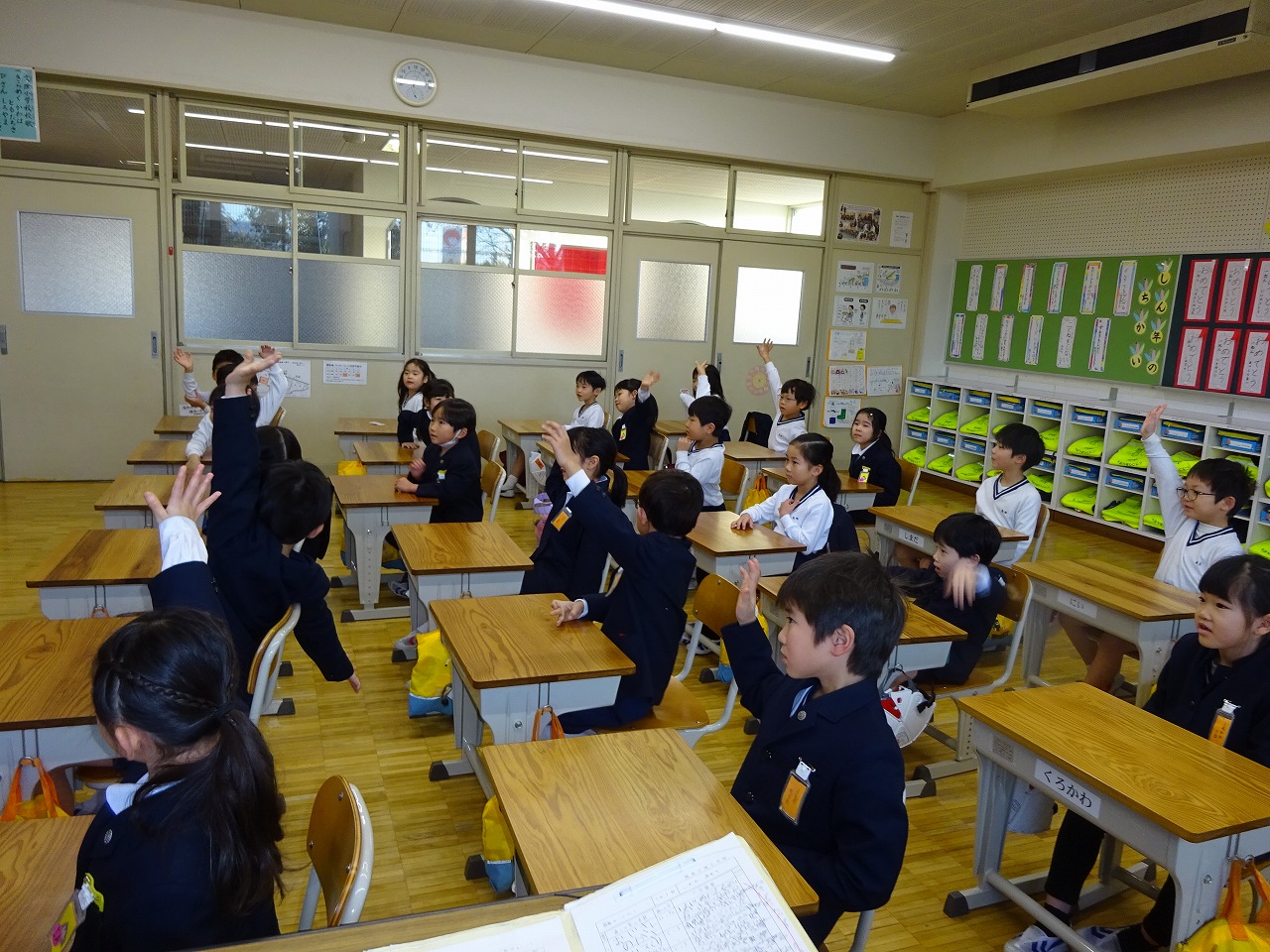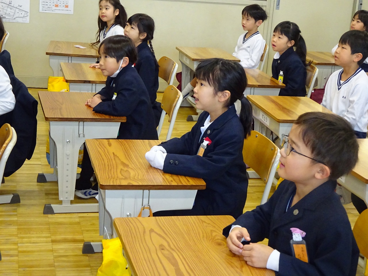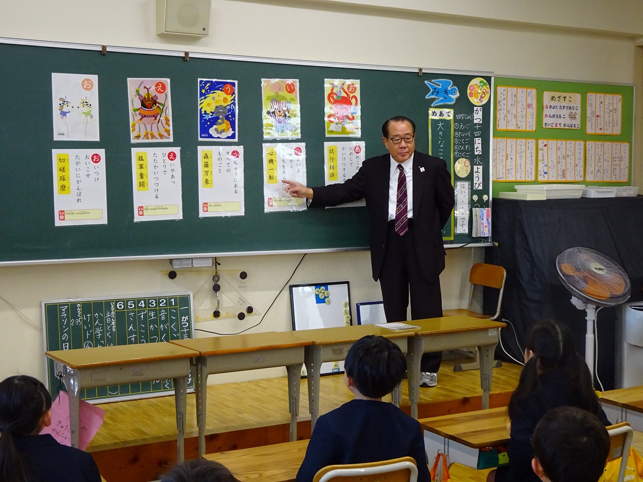 校長先生から「四字熟語の学習を始めます。」と言われた子どもたちは、「よじじゅくご?なに?」と、不思議そうな顔をしていました。「生活する中で、大切にしたいことやためになる言葉だよ。それを四つの漢字で表しているよ。」と教えていただきました。意味を教えていただいた後、校長先生の声に続いて、声を合わせて3回言ってみます。言いやすい四字熟語もあれば、なかなか苦戦するものもあります。でも、子どもたちは、覚えようと一生懸命でした。