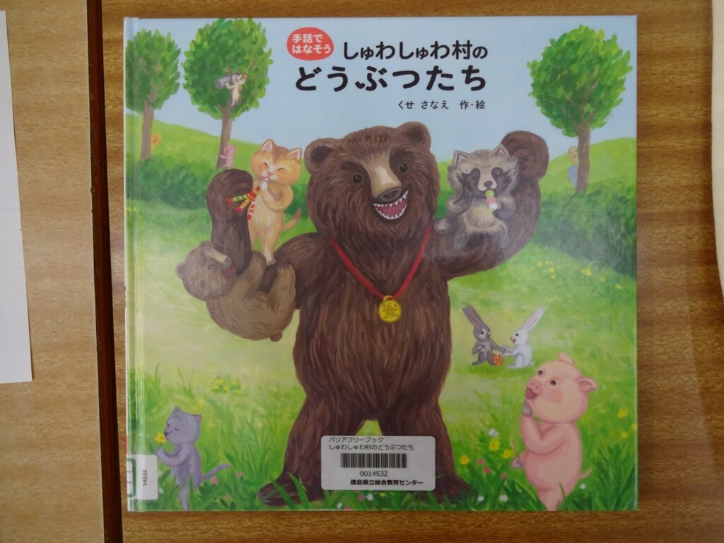 「しゅわしゅわ村のどうぶつたち」では、手話であらわされる動物たちのお話がおもしろいです。徳島県では、「手話は言語である」という認識にもとづき、聞こえる人と聞こえない人とが互いに理解し、尊重し合いながら暮らすことができる共生社会の実現を目指し、令和7年3月に「徳島県手話言語条例」が制定されました。最後に「こんにちは」といったあいさつや、自分の名前くらいは手話であらわすことを覚えてみようということで、子どもたちは必死に手の形を覚えていました。