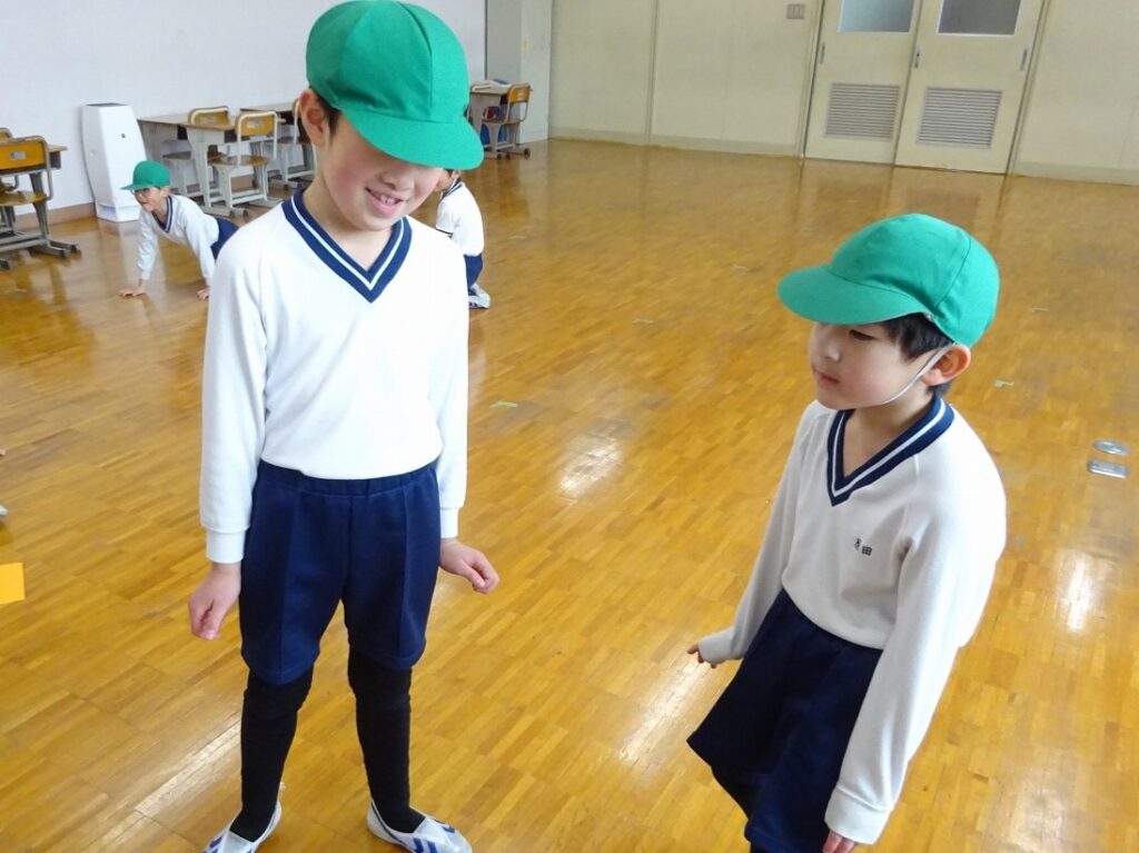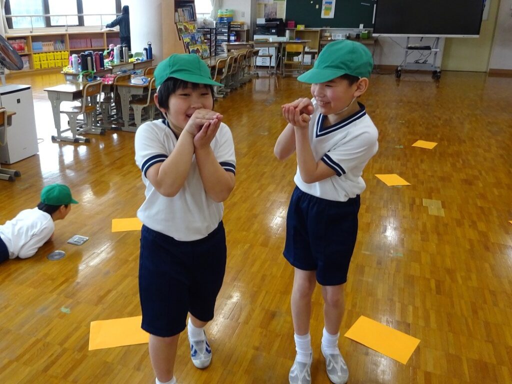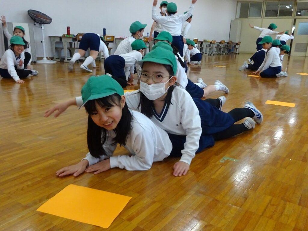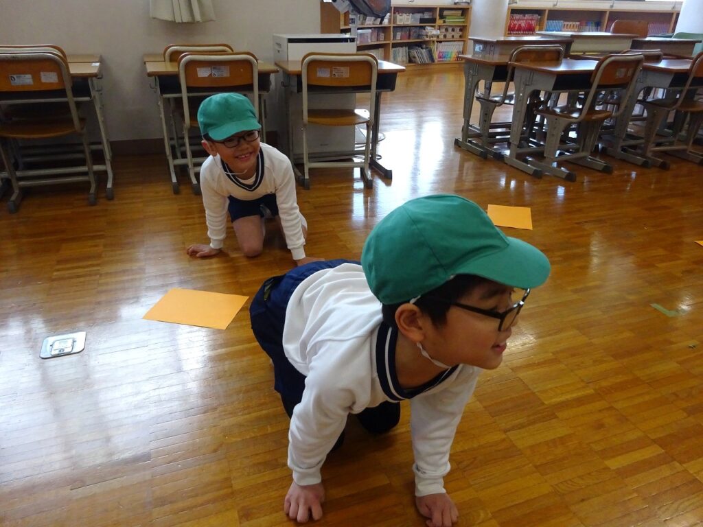 本日の体育では、自分たちが考えてきた好きないきものになりきりました。カマキリやコアラなどの様々ないきものになりきりました。帽子の色を白に変えて白い壁にぴったりとはりつき、カメレオンになりきっている子もいて、いきものの特徴を上手に捉えて表現することができていました。