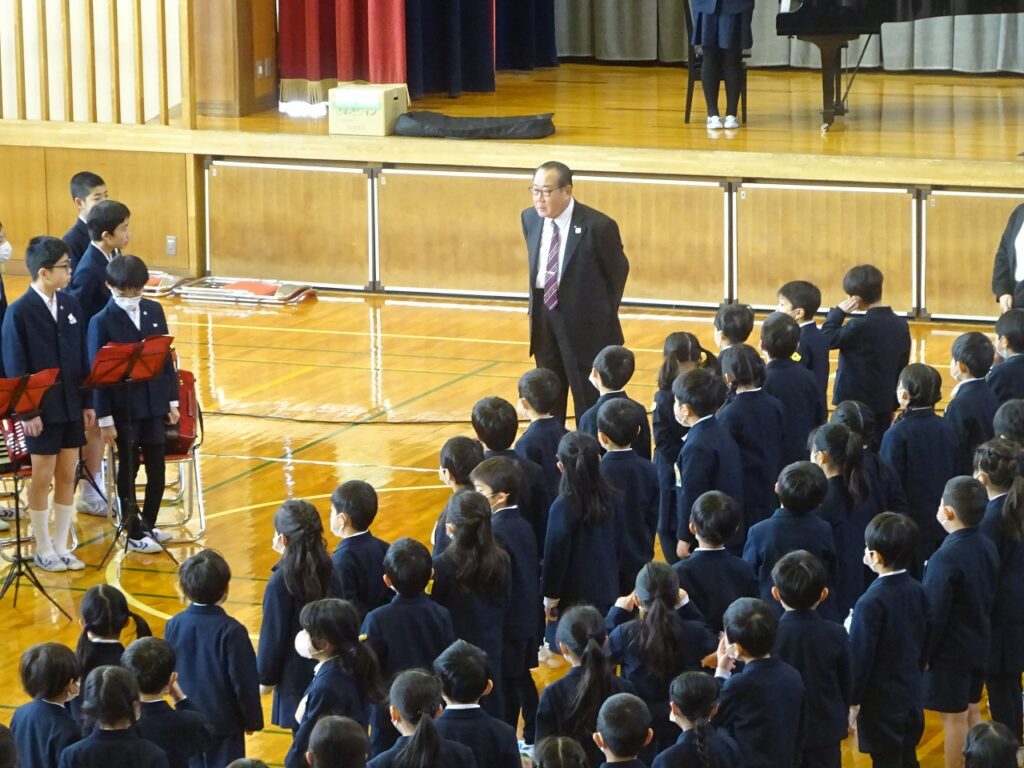 本日、児童朝会が行われました。徳島文理小学校では、毎週月曜日に行われています。本日は、校長先生のお話と、一味会に向けての練習が行われました。