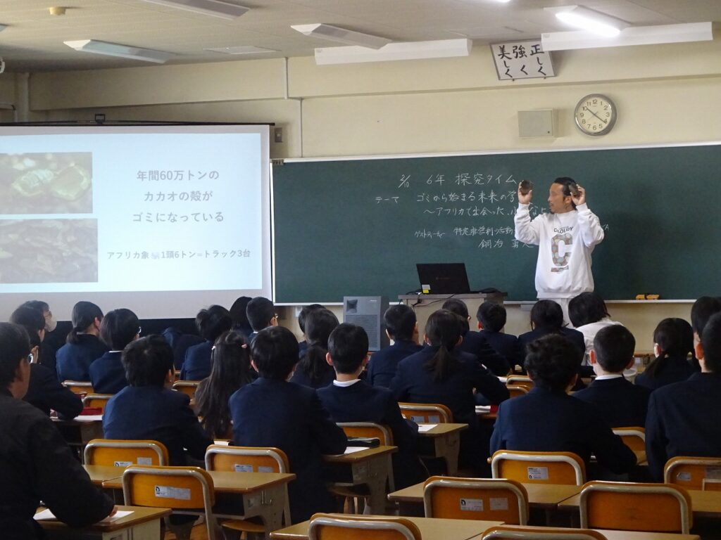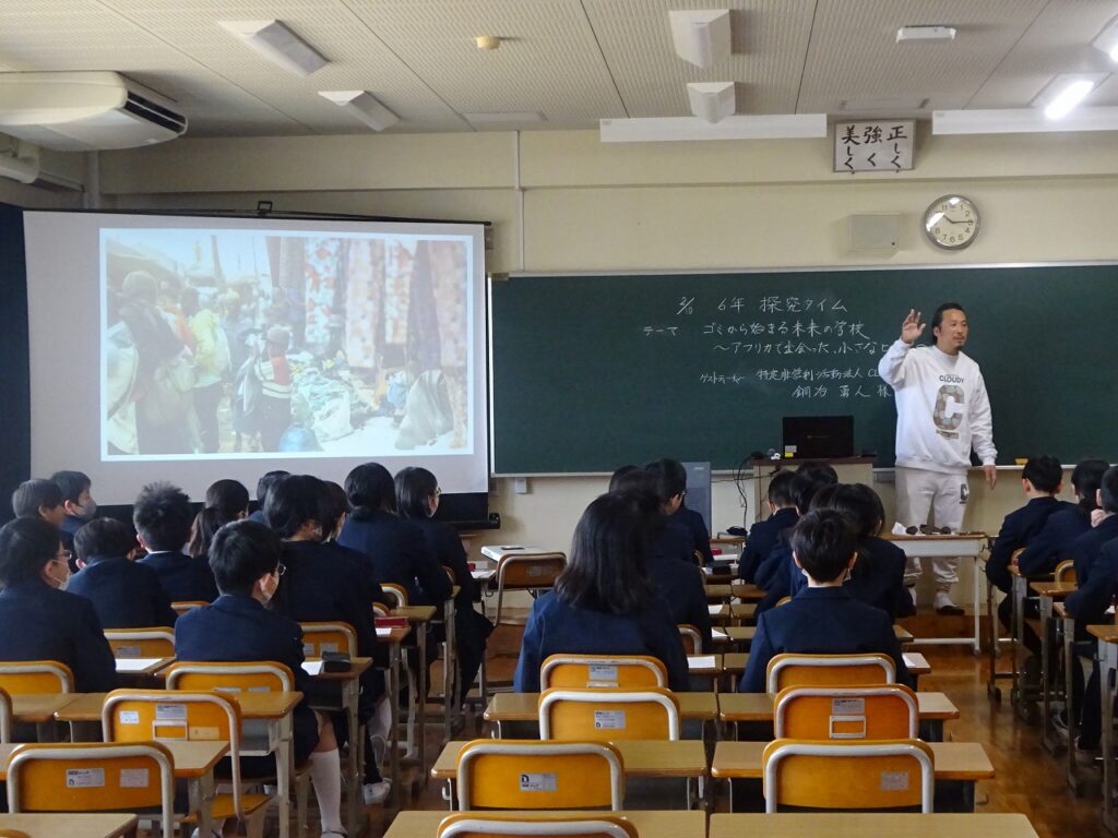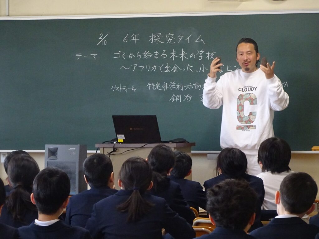 本日は、特定非営利活動法人CLOUDY代表理事の銅冶勇人様をゲストティーチャーとしてお招きし、6年生子どもたちを対象に『ゴミからはじまる未来の学校~アフリカで出会った、小さなヒント~』の講演が開かれました。