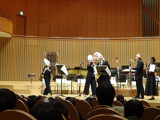 楽器紹介の後には、子どもたちに大人気の曲「ライラック」を演奏してくださいました。子どの中には口ずさみながら音楽を楽しんでいる子もいました。最後に、”にじ”を演奏してくださいました。演奏に合わせて子どもたちが歌を歌い、ホール全体が一体となっていました。