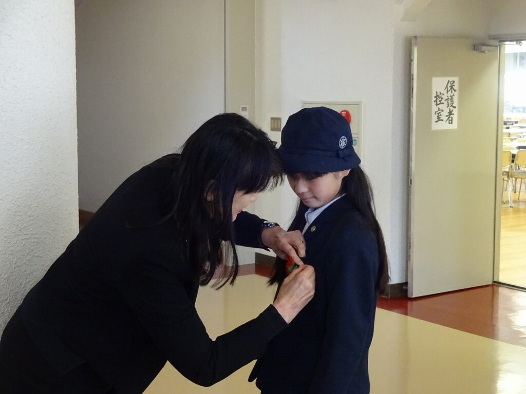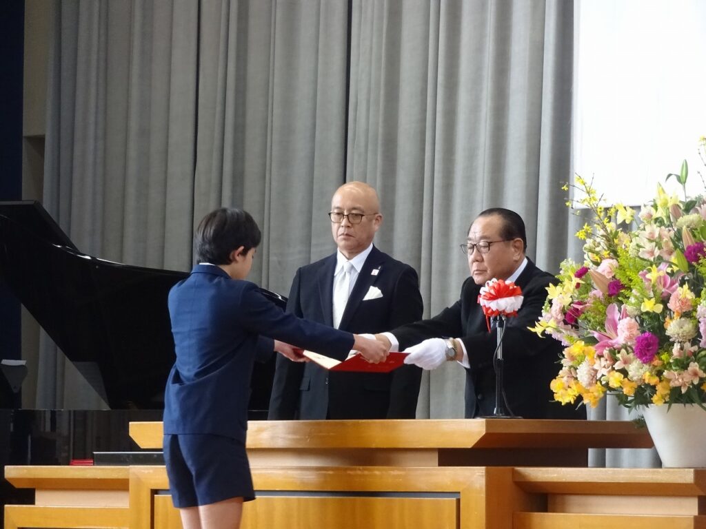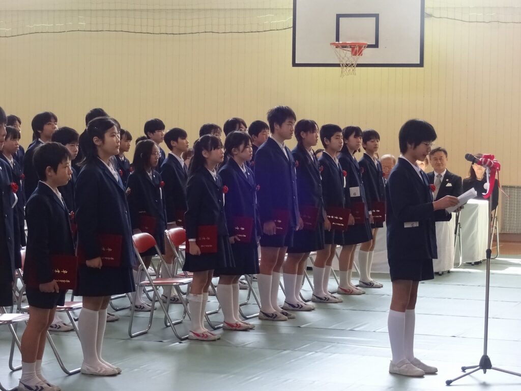 式では、担任からの呼名に一人一人が力強く返事をして、卒業証書を受け取りました。壇上に上がった子どもたちの引き締まった表情からは、6年間の課程を終えた喜びと、中学校生活への強い決意が感じられました。