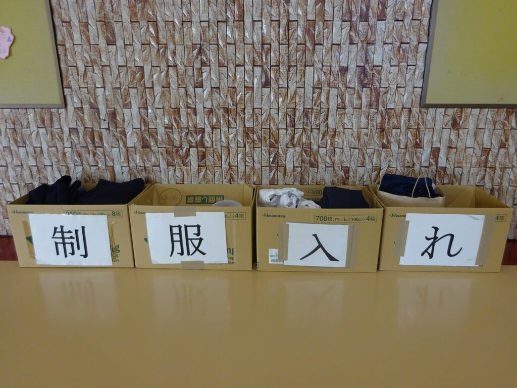 玄関に設置している回収ボックスには、先日卒業を迎えた6年生の保護者の皆様から多くの制服をご提供いただきました。回収した制服などは、後日希望される方へお譲りする予定です。ご協力いただいた保護者の皆様、ありがとうございました。