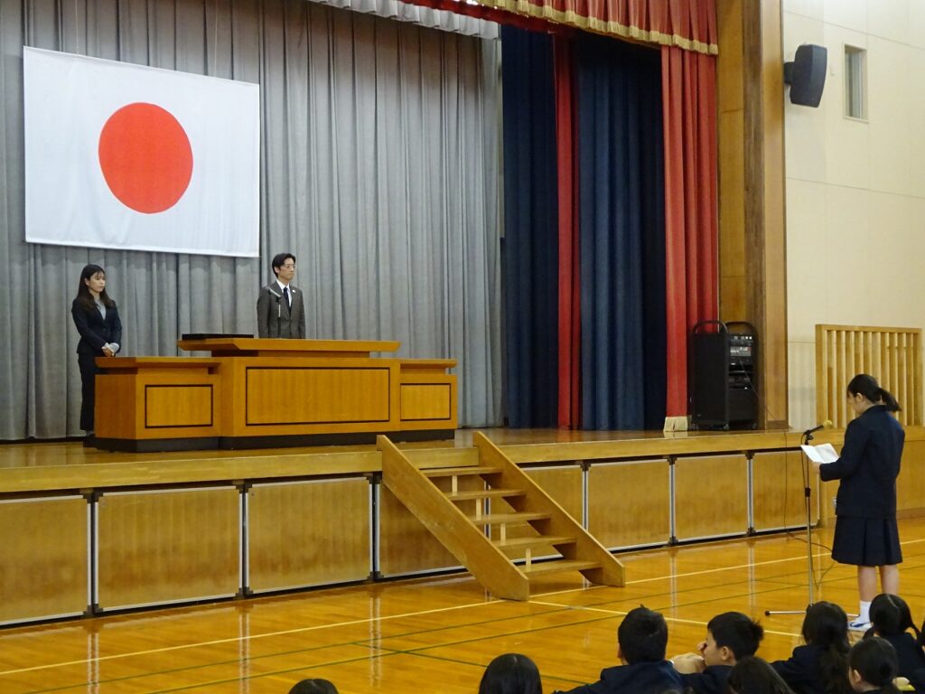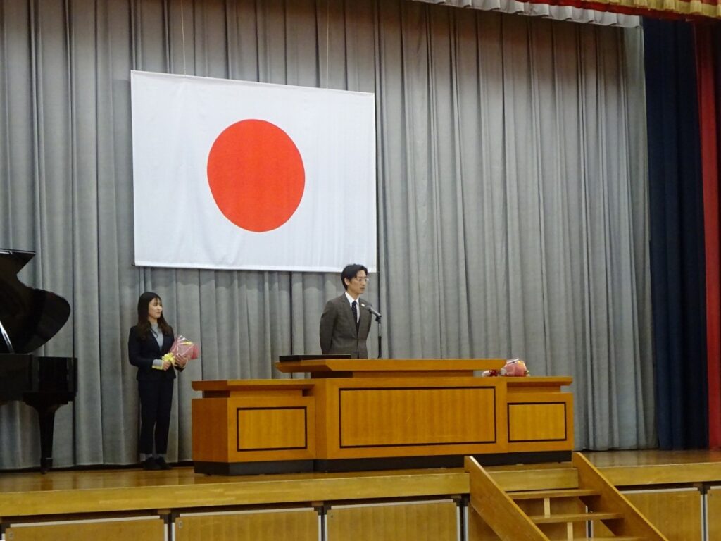 修了式に引き続き、離任式が行われました。今年度は3名の先生が離任されることとなり、校長先生よりご紹介がありました。児童代表がお別れの言葉を贈り、先生方からも最後の挨拶がありました。最後に、児童代表から花束を贈呈し、全校児童で感謝の気持ちを伝えてお別れをしました。