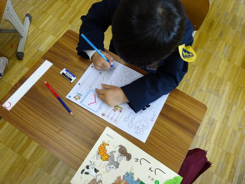 図工では、自分の好きなものを画用紙に描きました。描くのに夢中になって黙々と描いていました。書写では初めて ひらがなを学習しました。集中して丁寧な字を書くことができました。
