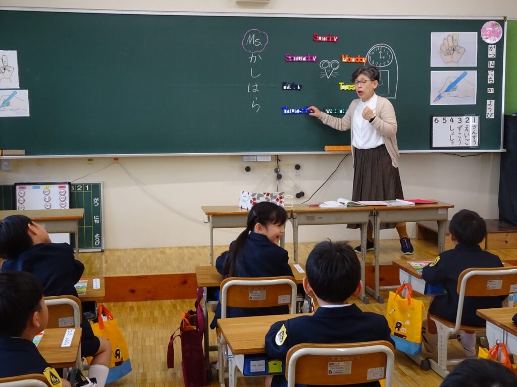 英語の学習は、樫原先生と。元気いっぱいに樫原先生の後に続いて英語で話していました。