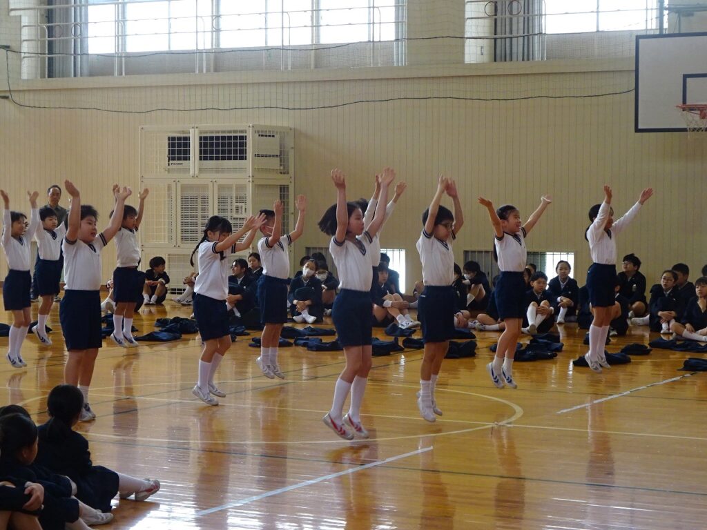 本日の児童朝会で、3年生が全校児童の前で「リズムジャンプ体操」を披露しました。