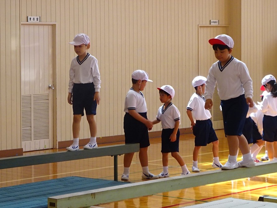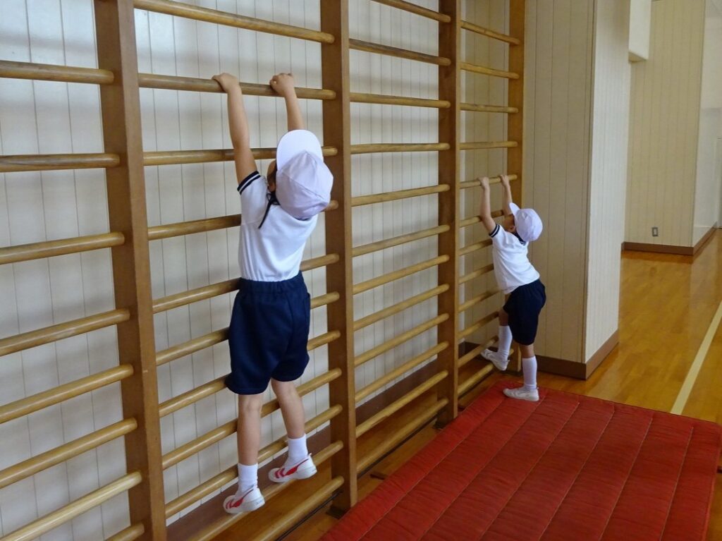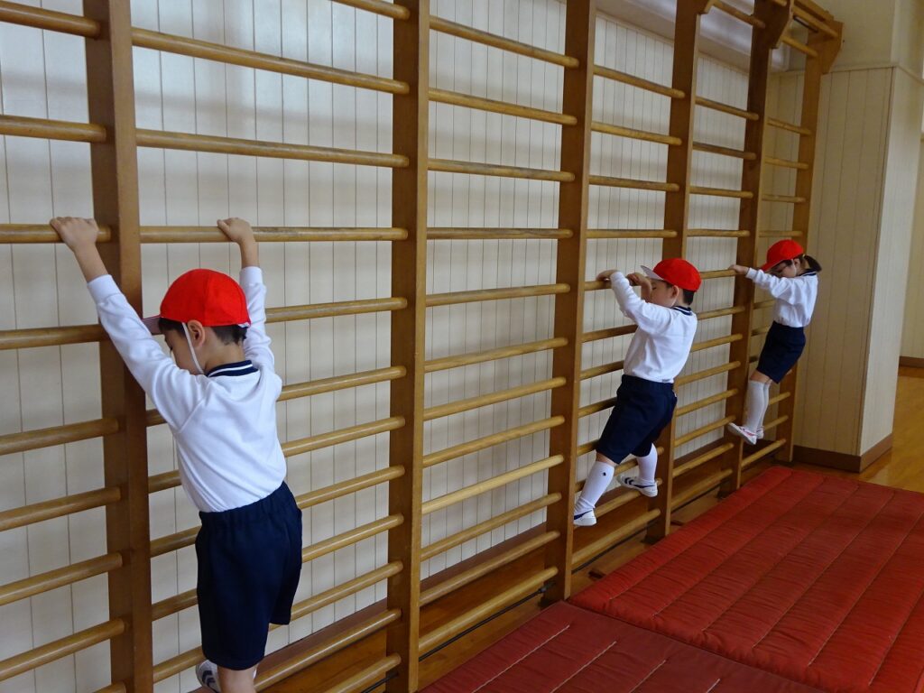 今日の体育では、ろくぼくとへいきん台を使って運動遊びをしました。ろくぼくでは手足を上手に使って横に移動したり、へいきん台ではバランスを取りながら慎重に渡ったりと、一生懸命に取り組んでいました。「楽しい!」「もう1回やりたいな」と言いながら、順番を守って、みんなで仲良く活動することができました。